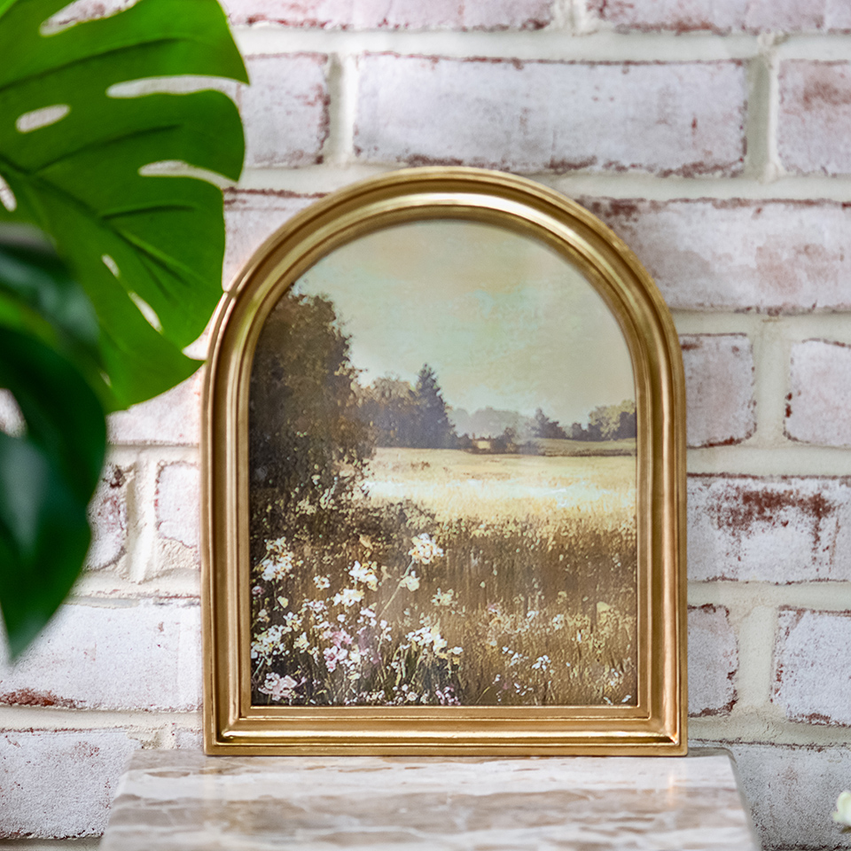 Bring a touch of sophistication to any space with this arched gold frame, featuring a serene landscape painting inside. Its graceful curves and warm gold finish make it a perfect accent for desks, shelves, or walls.